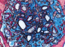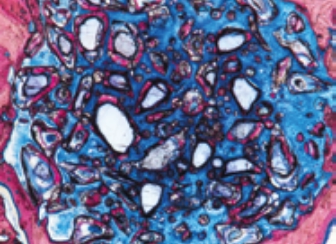 Nach 4 Wochen: Fibröses kollagenes Gewebe (blau) breitet sich im Defekt aus und umgibt das Knochenersatzmaterial. Eine zentripetale Knochenneubildung (dunkelrosa) ist bereits zu beobachten. 7 (In-vivo-Studie)