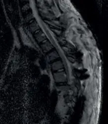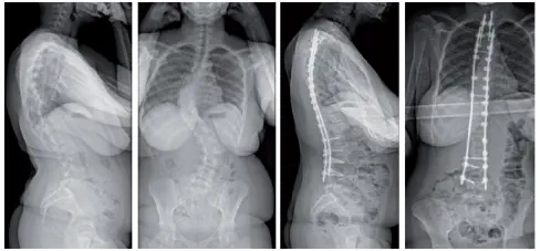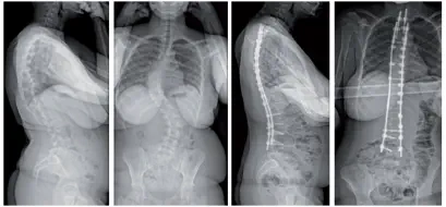 14 Jahre, adoleszente idiopathische Skoliose mit doppelter starker Krümmung, T2/L4 Arthrodese mit Jazz Frame-Fixation.